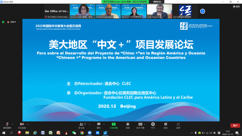 近日,以“构建国际中文教育高质量发展新格局”为主题的2022年国际中文教育大会暨交流周系列活动在北京启动,来自90多个国家和地区近1800名代表参加。12月15日,作为国际中文教育大会平行论坛之一的“美大地区‘中文+’项目发展论坛”顺利召开,论坛主要围绕“中文+”项目建设经验介绍、中外高校合作开展“中文+”项目的模式及分工探讨、“中文+”项目发展的困难、瓶颈和“中文+”项目发展需要的支撑政策四个议题展开。应教育部语言对外交流合作中心邀请,我校作为中拉高校代表之一参加了该论坛,副校长仇荣亮代表学校作主题报告。