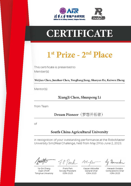 近期,RoboMaster 2023 高校Sim2Real挑战赛落下帷幕。经过激烈角逐,我校由陈浚钊、蒋永梁等5名本科生组成的Dream Pioneer(梦想开拓者)战队荣获亚军,这也是我校参加Sim2Real挑战赛以来的最好成绩。比赛冠军、季军、殿军分别由中国原子能研究所、清华大学、西安交通大学获得。