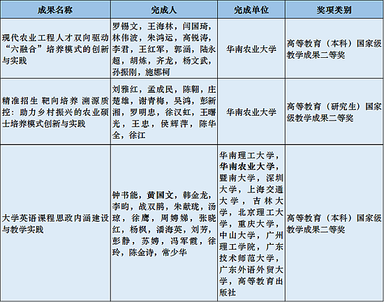 7月25日,教育部公布2022年国家级教学成果奖获奖项目名单,我校共获3项二等奖。其中,罗锡文院士等申报的成果《现代农业工程人才双向驱动“六融合”培养模式的创新与实践》获高等教育(本科)二等奖,刘雅红教授等申报的成果《精准招生 靶向培养 溯源质控:助力乡村振兴的农业硕士培养模式创新与实践》获高等教育(研究生)二等奖,黄国文教授参与的成果《大学英语课程思政内涵建设与教学实践》获高等教育(本科)二等奖。