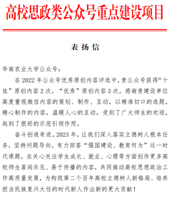 作为学校宣传和思政工作的重要平台,学校官微以“讲好华农故事,传播华农声音”为宗旨,广泛征集新闻线索、深入挖掘宣传亮点,坚持生产优质原创内容,打造新时代华农形象,努力擦亮华农品牌。作品多次获得广东省教育厅颁发的广东省教育好新闻一等奖、广东高校宣传思想工作优秀作品、广东省本科高校官微“十佳推文”等奖项。