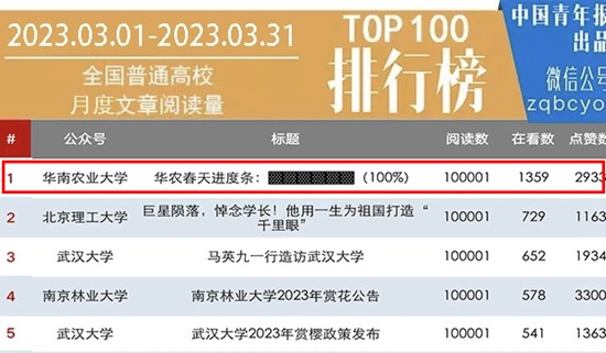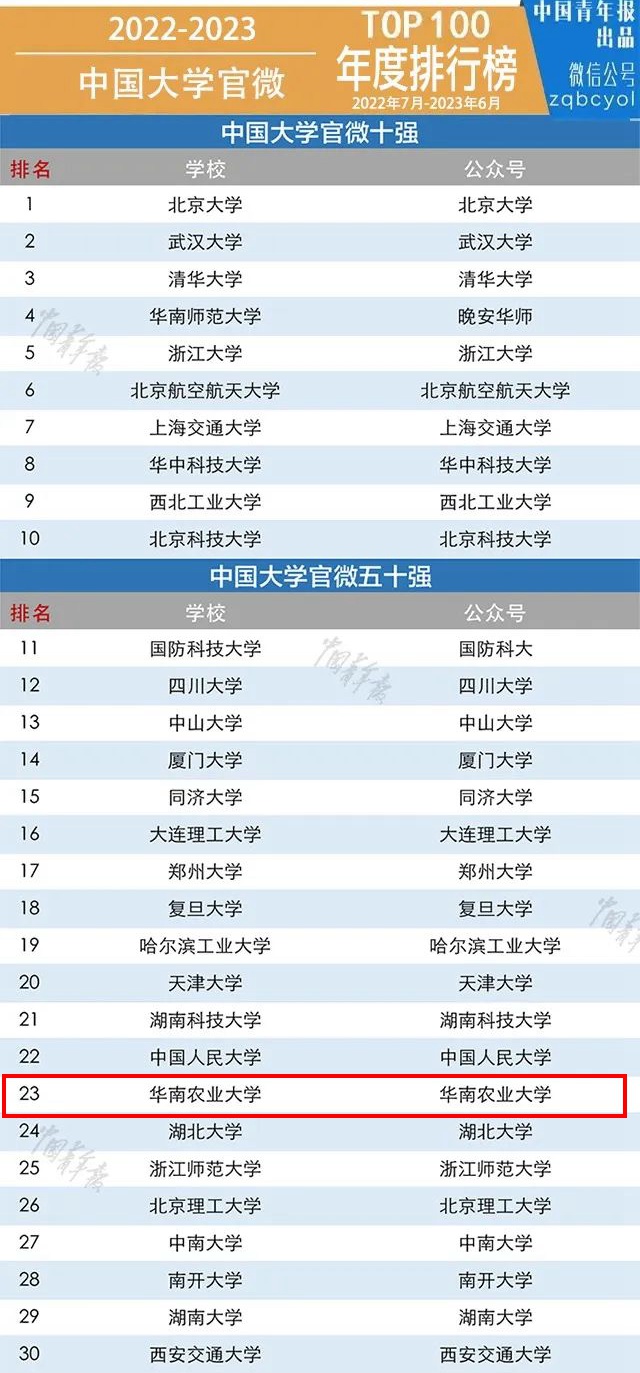 8月15日,中国青年报正式公布2022-2023中国大学官微年度排行榜,华南农业大学官微入选全国五十强,排名第23。这也是华农官微连续第6年入选全国高校微信公众号五十强名单,在全国农业高校中排名第一。