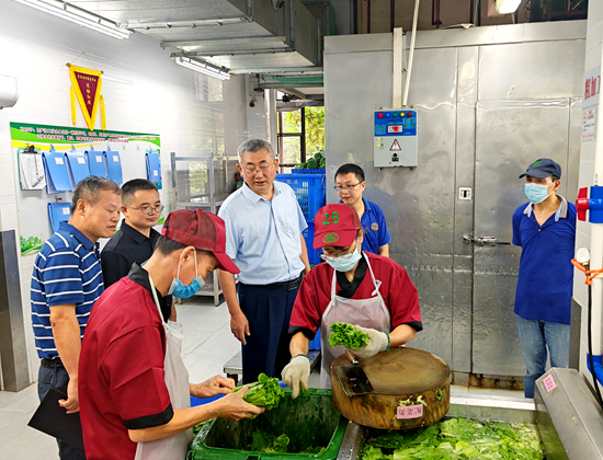 检查组一行先后对饮食中心下属荷园食堂、绿榕园食堂进行了实地查看,仔细检查环境卫生、仓库储存、现场操作、工用具分类使用、食品制售、“阳光厨房”监控视频以及消防器材设置等,重点核查了原材料索证索票、场所消毒记录以及食品留样情况。