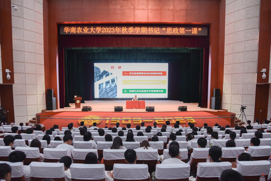 9月19日下午,华南农业大学2023年秋季学期“思政第一课”暨全省首批基层宣讲示范队伍——华南农业大学理论宣讲队首场宣讲在丁颖礼堂举行。校党委书记李凤亮以《厚植文化自信 谱写青春华章》为题作报告。2023级本科生代表、研究生代表,全体思政课教师,各学院党委书记、副书记、辅导员等共计560余人现场听讲。省委宣传部讲师团有关负责同志参加活动。校党委副书记邓国安主持活动。