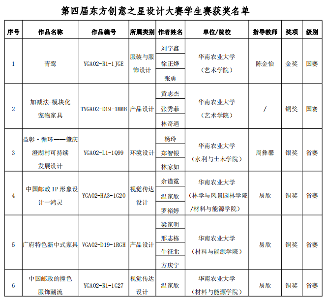 近日,2023年度东方创意之星系列赛事公布最终评审结果,我校师生取得佳绩。在东方创意之星教师教学创新大赛(以下简称“教师赛”)中,我校获得国赛金奖3项、铜奖2项,省赛铜奖4项;在第四届东方创意之星设计大赛学生赛(以下简称“学生赛”)中,我校获得国赛金奖、铜奖各1项,省赛银奖1项、铜奖3项。材料与能源学院承担校赛组织工作,我校赢得粤港澳赛区“优秀组织单位”称号。