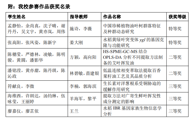近日,第九届全国植物生产类大学生实践创新论坛暨大学生创新创业训练计划成果展在广西大学举行。本次赛事由高等学校国家级实验教学示范中心联席会植物/动物/农林/水产学科组主办,广西大学承办。全国16所高校200余人参加交流研讨。我校参赛作品获得特等奖2项、二等奖2项、三等奖3项。