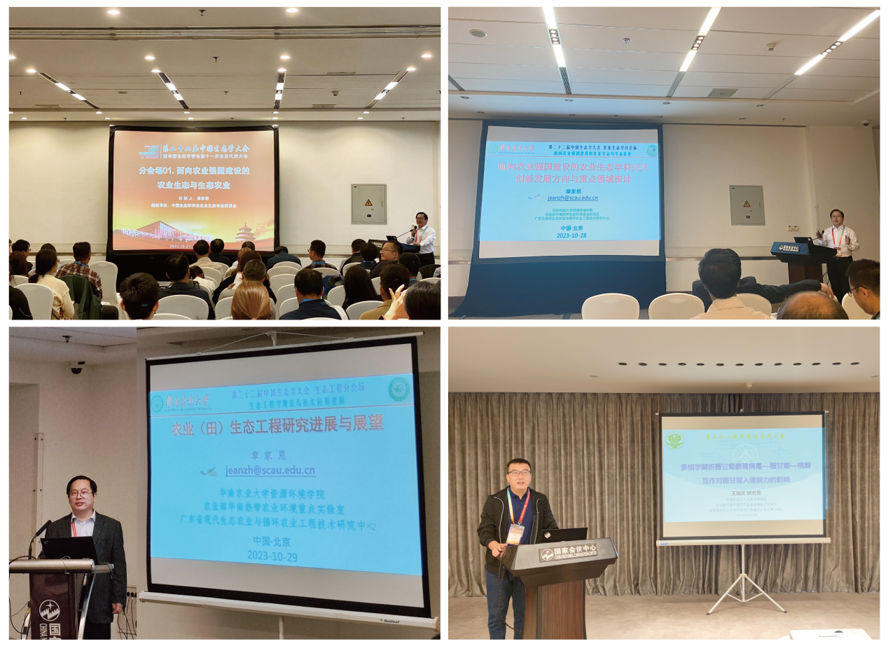 章家恩召集并主持了大会的第一分会场,主题为“面向农业强国建设的农业生态与生态农业”。他在会上作了题为《面向农业强国建设的农业生态学交叉创新发展方向与重点领域探讨》的专题报告,并在第八分会场作了题为《农业(田)生态工程研究进展与展望》的专题报告。在第十三分会场,我校资源环境学院研究员王瑞龙作了题为《多组学解析薇甘菊萎蔫病毒—桃蚜—薇甘菊互作对薇甘菊入侵能力影响的机制》的专题报告。