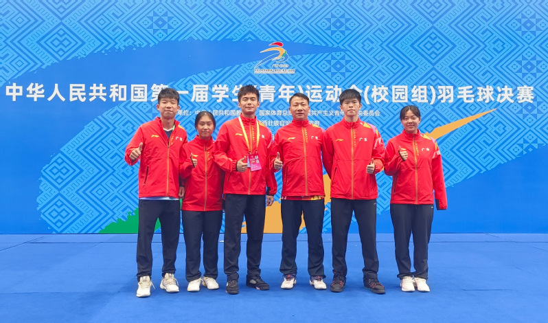 中华人民共和国第一届学生(青年)运动会羽毛球赛近日在广西南宁举行。来自各省、自治区、直辖市和特别行政区的25支代表队、430名运动健儿齐聚广西大学追逐青春梦想。我校教练员曾海清、吴瑾龙,运动员黄炜皓、李涛裕、戴昱欣、李素如兰随广东省代表队出战,经过激烈角逐,最终随队获得男子团体铜牌(黄炜皓、李涛裕)、女子团体第七(李素如兰、戴昱欣)、男子双打银牌(黄炜皓)、女子单打第八(李素如兰)。