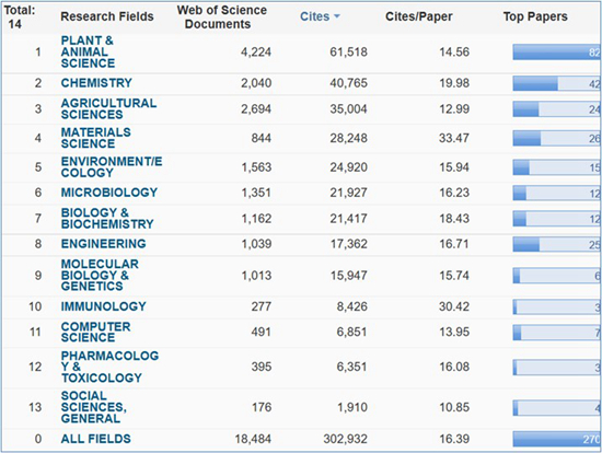 本期我校进入全球前1%的13个ESI学科如下:植物学与动物学、化学、农业科学、材料科学、环境科学与生态学、微生物学、生物学与生物化学、工程学、分子生物学与遗传学、免疫学、计算机科学、药理学与毒理学、社会科学总论(依被引次数排序,图1)。