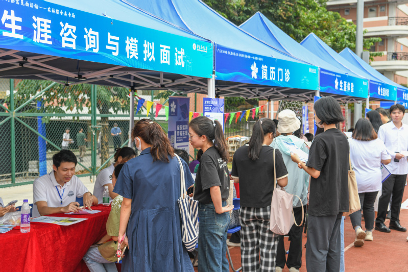为让毕业生在职业生涯中抢先一步,高质量就业,华南农业大学紫荆生涯工作室在本次活动中设置就业服务专区,为低年级学生提供“生涯咨询、生涯体验”服务,学生通过生涯游戏,认识自我、了解行业、规避风险;为毕业生提供“简历门诊、模拟面试、就业政策咨询”服务,为毕业生开展就业技能提升辅导与实战演练,增强就业竞争力,帮助毕业生实现校园到职场的身份转换。本次服务同时面向今年来华南农业大学参加宏志助航培训的700余名学员开放,为学员提供持续性就业辅导与岗位推荐服务。