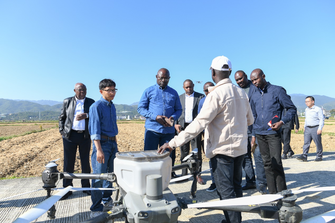 万绿智慧农场由东源县政府牵头,广东万绿智慧农业科技有限公司与罗锡文院士团队合作共建。团队现场演示了无人驾驶旋耕、无人驾驶油菜播种、无人驾驶水稻收获和无人机播种等项目。恩戈博希一行认真观摩演示,并了解项目建设和应用情况。