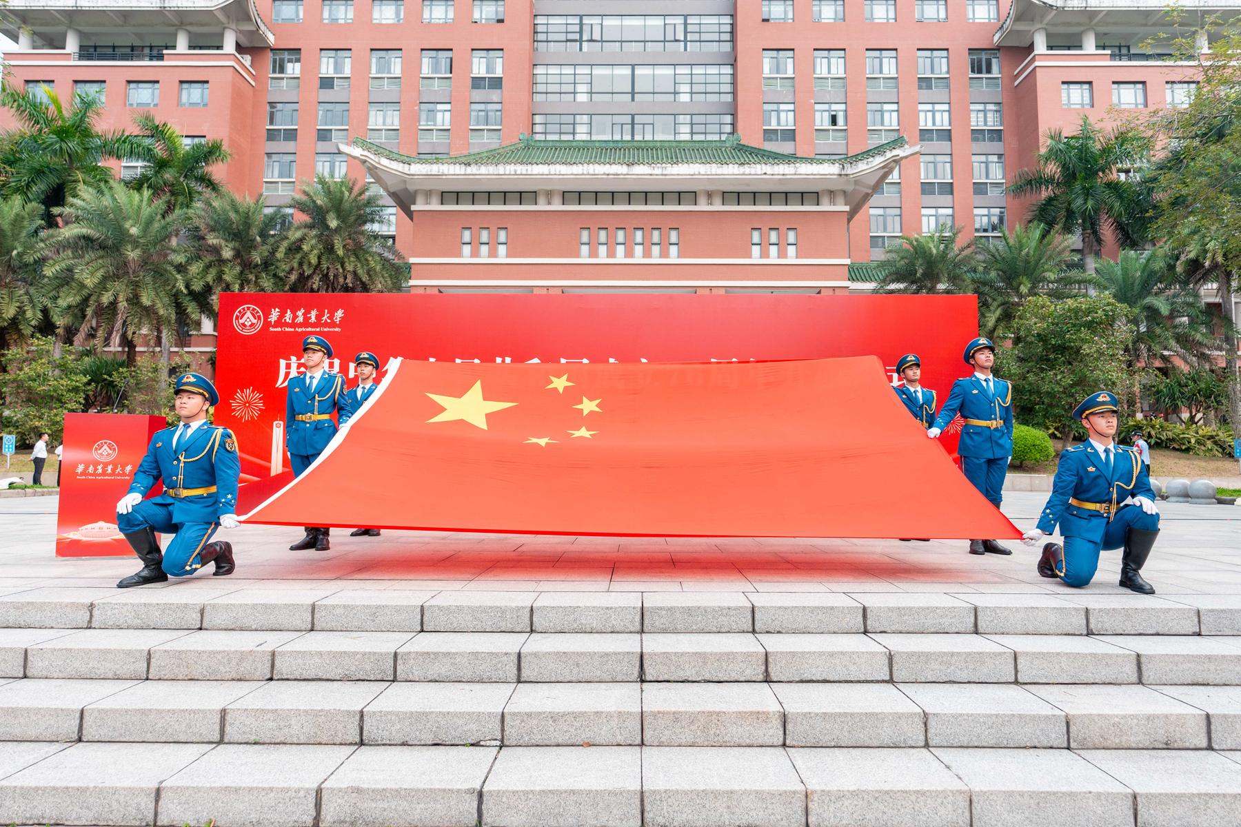 现场,一面特殊的国旗格外引人注目。这面编号2009-1048的国旗曾于2009年11月10日在天安门广场升起,当天恰逢华南农业大学建校100周年。这份珍贵的礼物,见证了学校与祖国同频共振的办学历程。“爱国护旗,农心向党,团结奉献,意志如钢,以我火热之青春,捍卫国旗之尊严,做修德、博学、求实、创新的华农学子!”国旗护卫队同学在国旗下庄严宣誓。