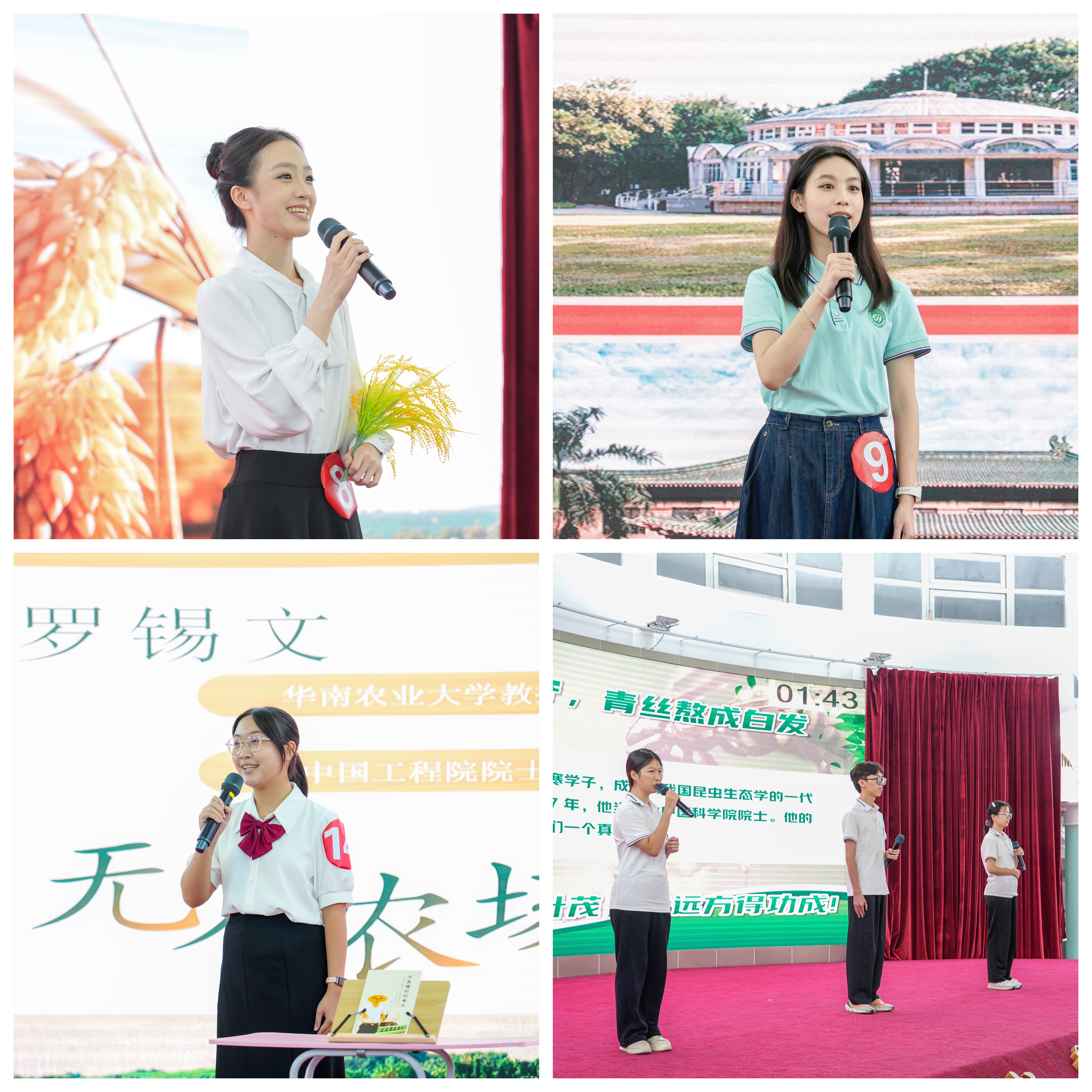 决赛现场,15组选手倾情讲述了丁颖、赵善欢、卢永根等一批杰出农业科学家的感人事迹。声情并茂的讲述外,选手们也各显所长,在舞台上以视频、乐器演奏、情景表演、实物道具等丰富形式,让故事更加立体,烘托温馨热烈的氛围,将观众带入场景,让一位位农业科学家的形象格外生动鲜活。年轻的声音与科学家们的嘱托在礼堂交汇,完成了一场跨越时空的庄严对话赛场下掌声连连,如穗粒摇曳作响。
