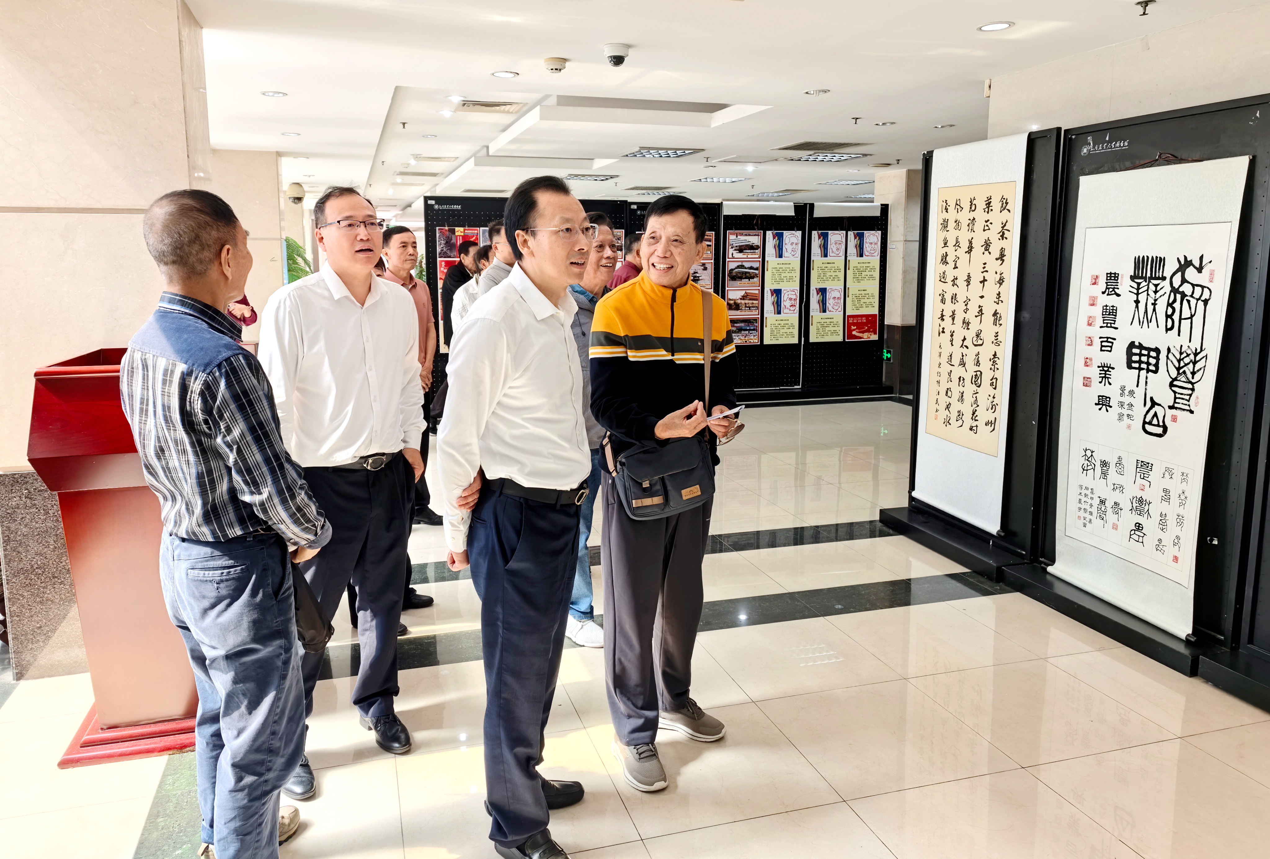 11月6日,华农离退休教职工“金蛇银龄·大美华农”书画摄影诗词作品展在图书馆一楼展厅开幕。学校党委书记李凤亮、党委副书记丁红星等领导出席并参观展览。