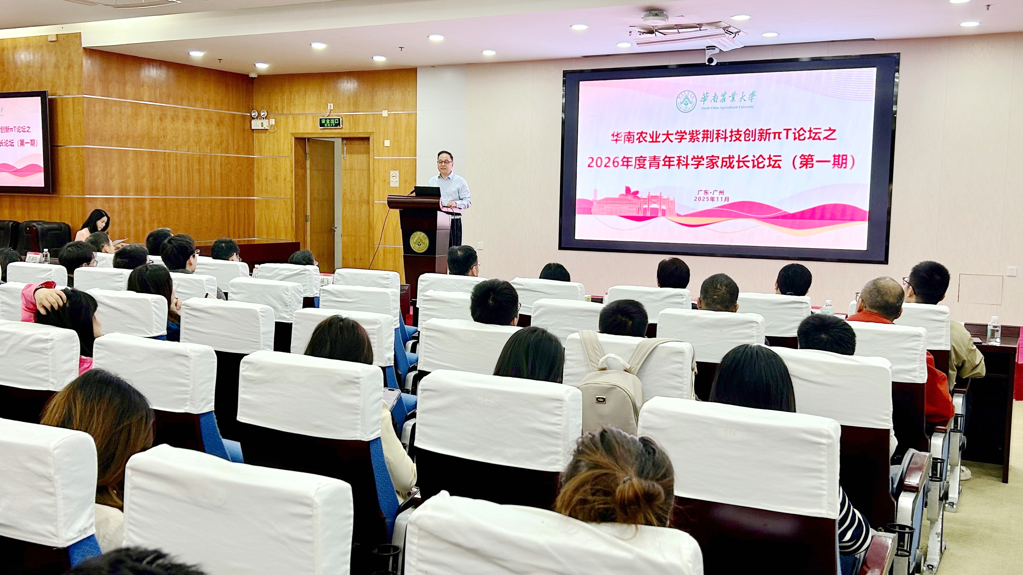 为做好2026年度的基金及人才类项目申报工作,搭建青年科学家交流平台,促进青年科技工作者成长,11月12日,华农在行政楼三楼报告厅举办紫荆科技创新πT论坛之2026年度青年科学家成长论坛(第一期)。副校长仇荣亮出席论坛并致辞。