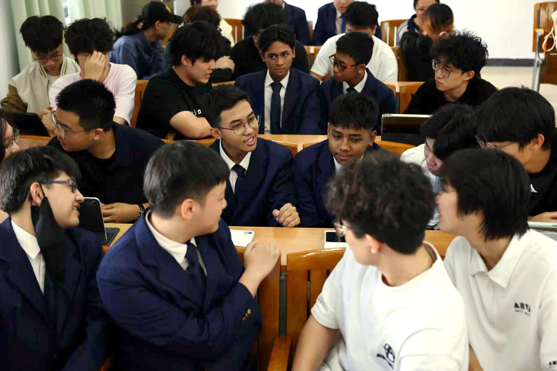 在第四教学楼课室,代表团上了一堂数学与信息学院的智慧教学课。课堂上,代表团学生积极互动,展现出强烈的求知欲。课后,双方师生围绕课程内容、中新教育模式及升学发展等话题展开了讨论,现场思维碰撞不断,交流氛围热烈。