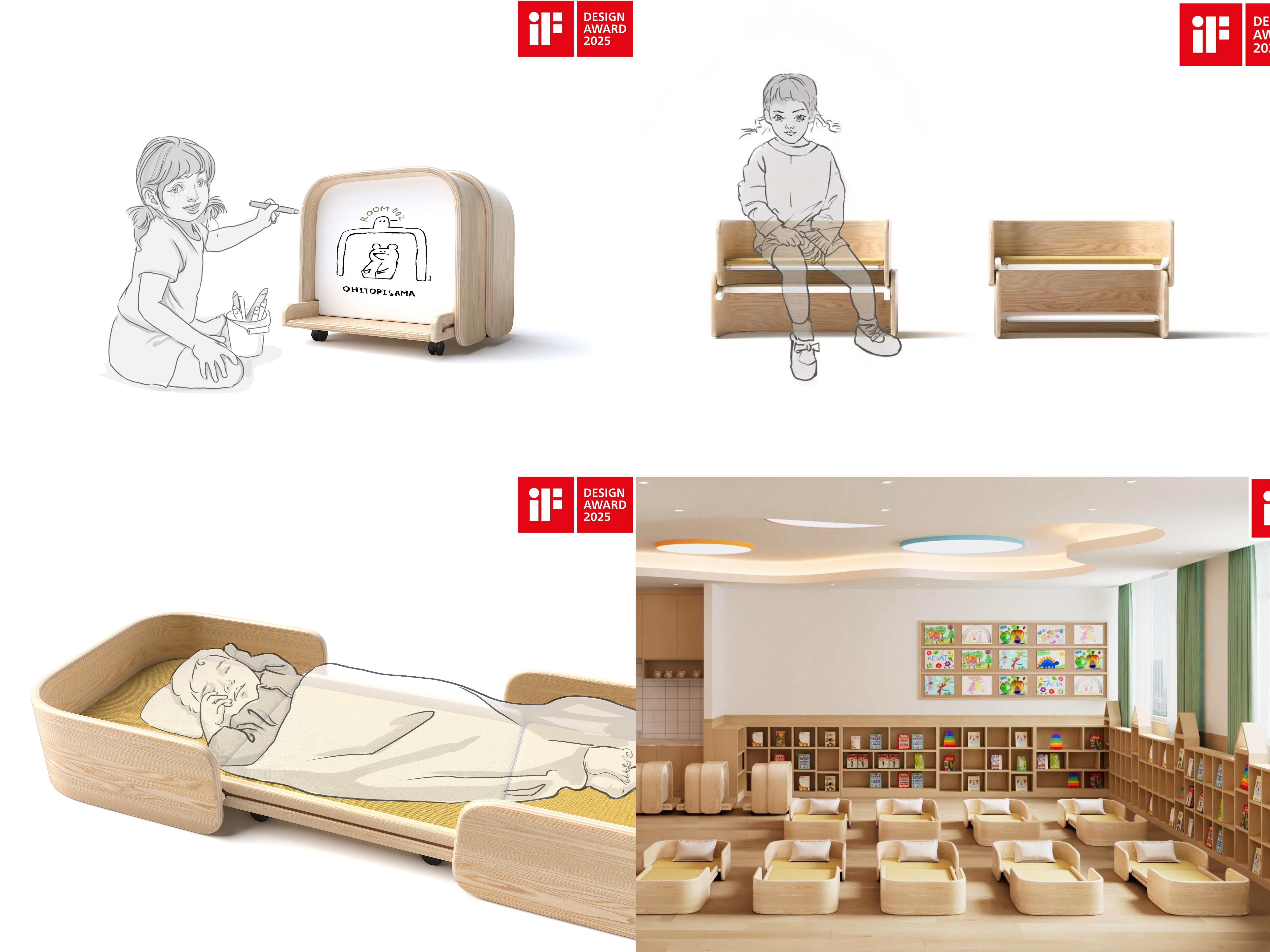 设计说明:Kindergarten Nap Bed核心围绕可持续发展教育(ESD)理念展开。午睡床可折叠为移动小画板,使用寿命末期还能重组成儿童椅子,实现功能高效整合与转化;无五金件的设计则最大程度降低幼儿使用安全隐患。作品在满足幼儿休息、绘画需求的同时,将可持续发展理念潜移默化融入日常互动,实现家具功能与教育价值的统一。该作品同样源自华农与慕思股份的产学研合作,参与设计的学生均来自艺术学院本科生C+家具设计工作室。