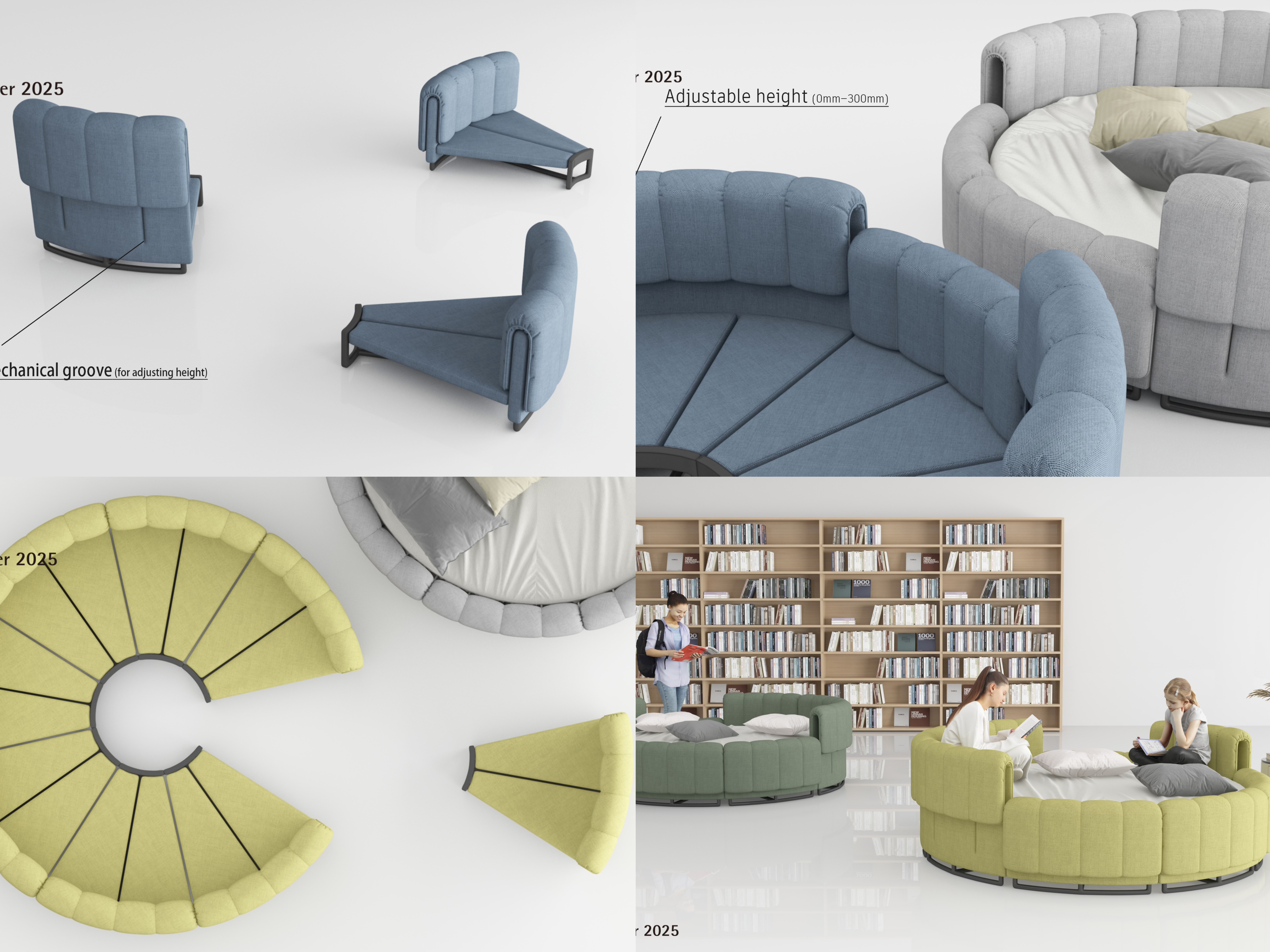 设计说明:Petal Bed以花瓣为设计灵感,采用模块化圆床结构,由八个相同模块组装而成,零部件可拆装、回收、替换,有效降低生产环节的物质消耗。其靠背具备升降功能,适配图书馆、户外休闲等多场景,围合式设计更利于拉近人际距离、促进交流。在材质选择上,作品采用植物纤维布料与再生金属,深度践行可持续设计理念。