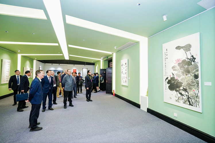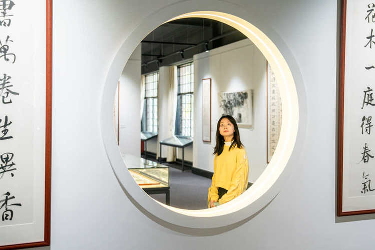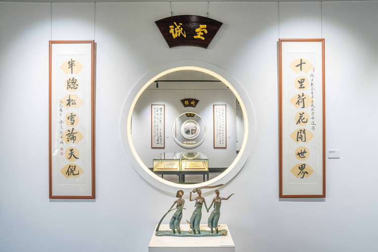 “最让我眼前一亮的是圆形‘框中框’设计的书画展示区,让静态的书画都带上了层次感。”人文与法学学院2025级汉语言文学专业的蔡同学在参观后分享道,“书画作品里的笔墨线条、花鸟意象,都让我感受到了中式艺术对自然、意境的追求。”