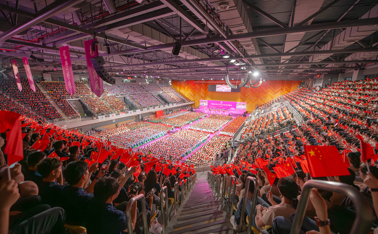 开学典礼上,全体新生挥动国旗