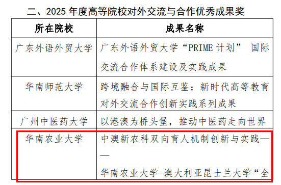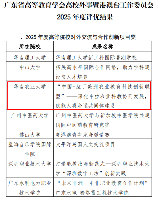 《“中国-拉丁美洲农业教育科技创新联盟”——深化中拉农业科教协同发展,赋能人类命运共同体建设》荣获2025 年度高等院校对外交流与合作创新项目奖,《中澳新农科双向育人机制创新与实践——华南农业大学-澳大利亚昆士兰大学“全球兽医护理与创新:探索中国动物健康2025”交流项目》荣获2025 年度高等院校对外交流与合作优秀成果奖。