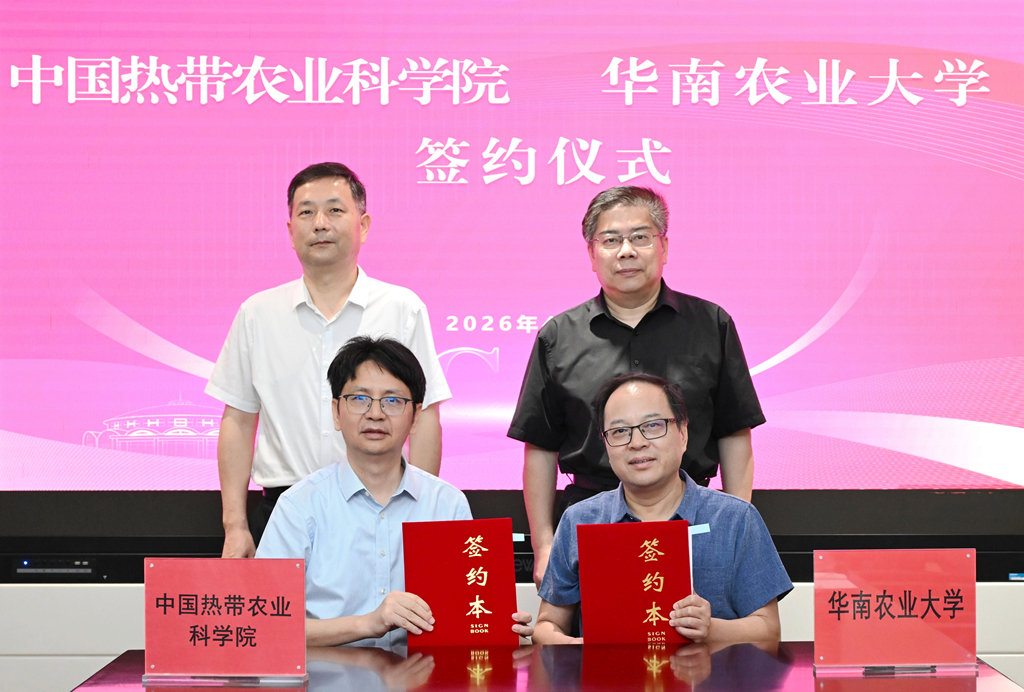 4月23日,华南农业大学与中国热带农业科学院(以下简称“中国热科院”)签订合作框架协议,双方将聚焦热带农业领域,在人才培养、科技创新、成果转化、国际合作等方面开展全方位合作,探索共建科教融合平台,推动校院深度融合、共赢发展。中国热科院院长陆宴辉、副院长谢江辉,华南农业大学校长薛红卫、副校长仇荣亮参加签约仪式。