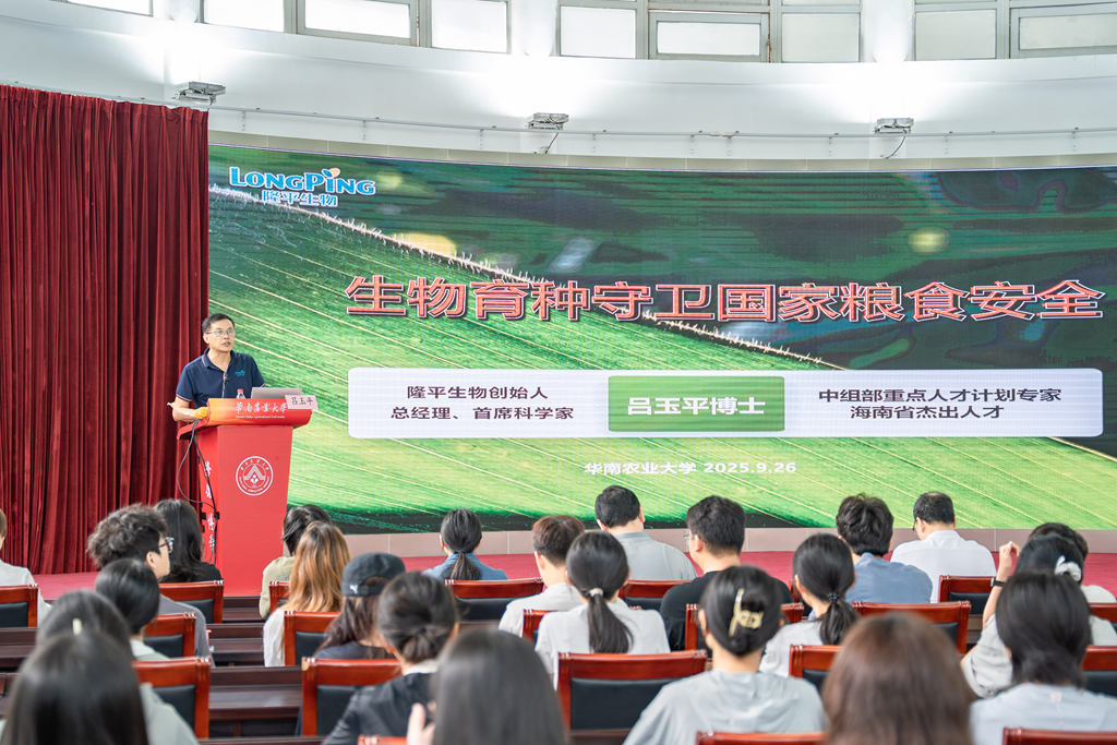 在红满堂,隆平生物技术(海南)有限公司创始人、总经理、首席科学家吕玉平博士以“生物育种守卫国家粮食安全”为题,以玉米育种为切入点,分享了自己从科研攻关到产业深耕的创业经历,介绍了生物育种领域的前沿进展。他勉励华农学子树立远大理想,融入国家战略,夯实专业根基,拥抱前沿科技,深入产业一线,解决行业痛点,敢于吃苦,奋斗不息,创新不止。