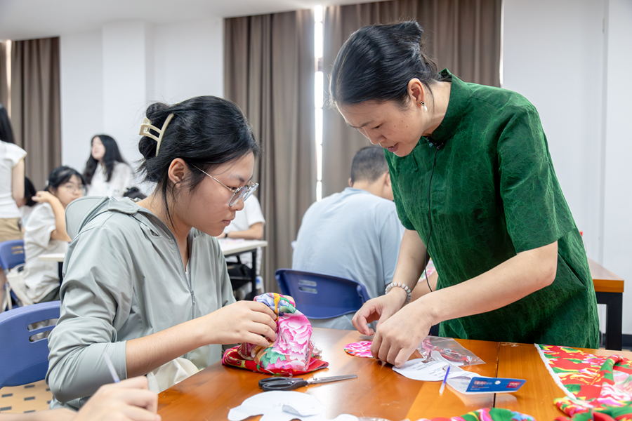 在手工创意课堂上,艺术学院副教授陈金怡手把手带领同学们体验手工创作,在一针一线的缝制中体验农耕艺术的魅力。在大家的巧手下,充满怀旧气息的花布片“摇身一变”,成了一个个独具匠心的大花被面公仔,模样憨态可掬,令人忍俊不禁。现场气氛热烈,欢声笑语不断。
