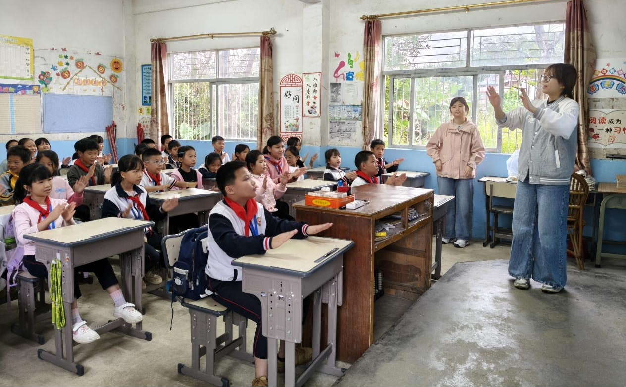 据悉,自11月9日起,华农美育团队已先行在凤安镇中心小学、凤安中学开展为期一周的“送教下乡”美育实习。华农学子创新教学方式,以“学玩结合”为核心,将“音乐剧美育”融入课堂,运用奥尔夫教学法引导学生通过肢体律动、节奏卡片等方式参与音乐活动,并结合《大鱼海棠》等影视内容进行情景教学,激发学生表达与创造的热情。