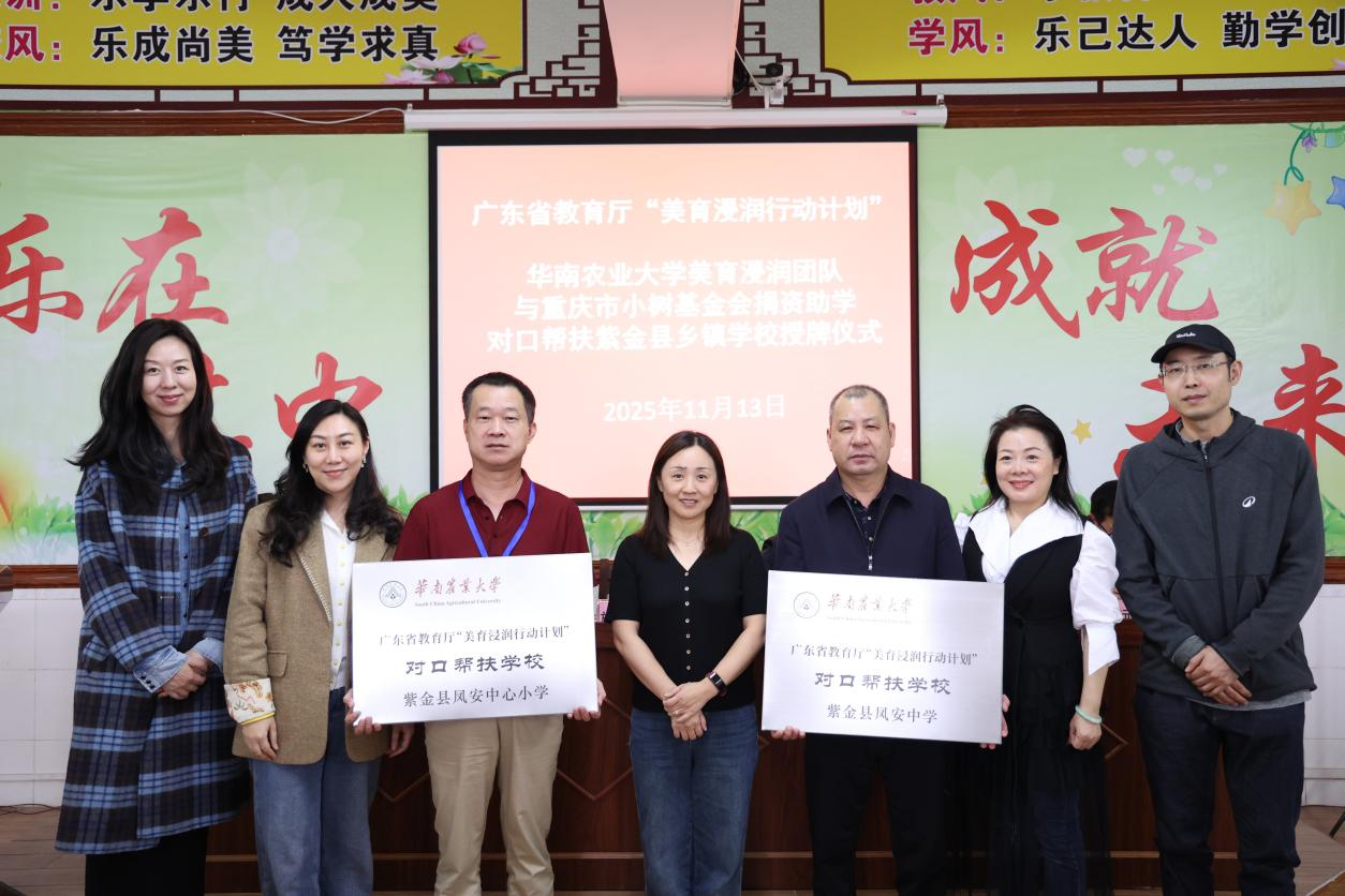 活动举行了 “美育浸润行动计划”对口帮扶学校授牌仪式。华南农业大学联合重庆市小树公益基金会向紫金县多所乡村小学捐赠价值逾13万元的助学物资,并赠予“小树图书馆”牌匾,为当地美育资源注入新动力。座谈会上,与会双方围绕师资培训、课程建设等议题深入交流,并就规划美育夏令营、送教下乡以及艺术专长培优等工作达成共识。